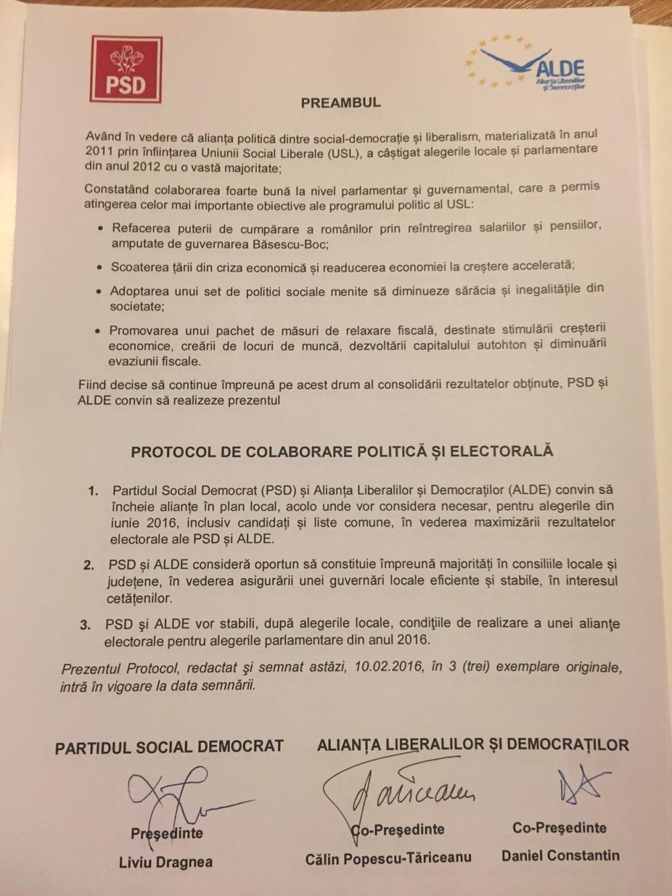 PSD și ALDE au semnat acordul pentru alegerile locale- DOCUMENT