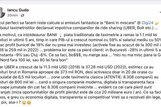 Războiul taximetriștilor cu UBER/BOLT. Iancu Guda scoate cifrele: O companie transparentă și digitalizată face jumătate din cât fac 8308 companii învechite