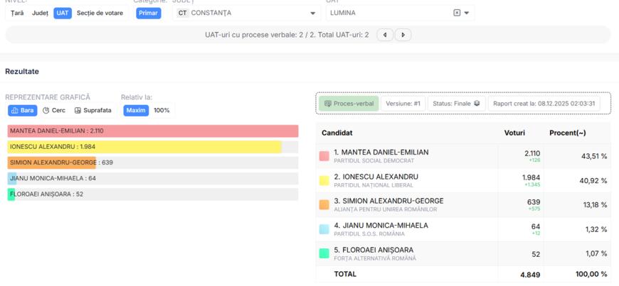 Daniel-Emilian Mantea (PSD) a răsturnat scorul și l-a depășit la limită pe Alexandru Ionescu (PNL), în cursa pentru comuna Lumina din județul Constanța.