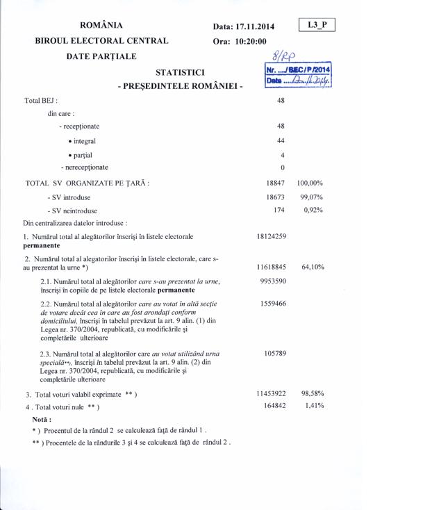 REZULTATE ALEGERI PREZIDENȚIALE 2014. BEC, REZULTATE FINALE