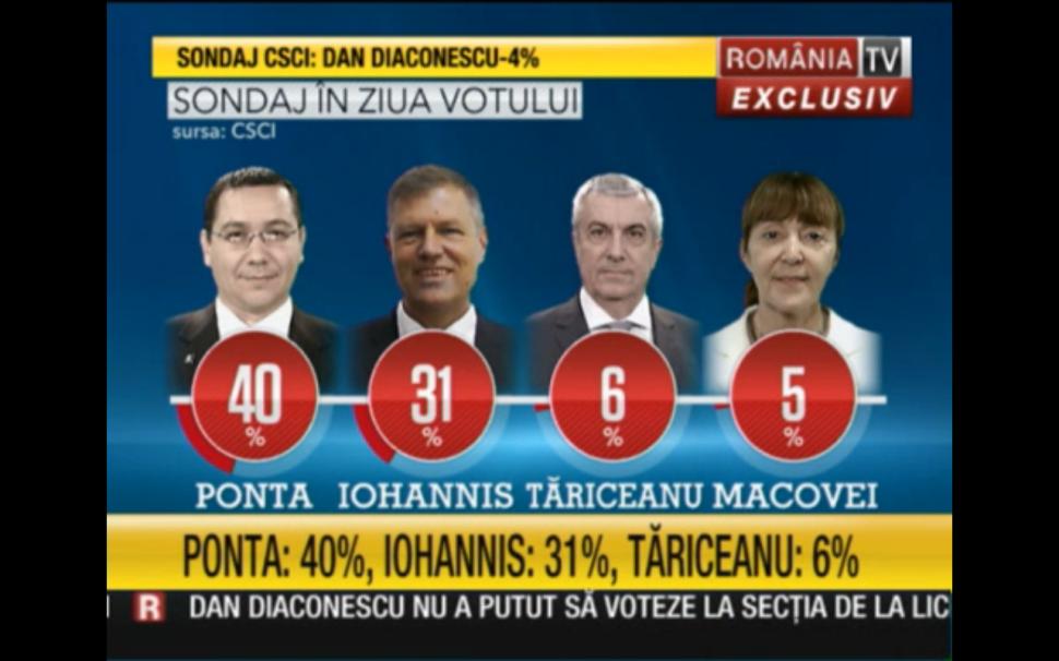 REZULTATE ALEGERI PREZIDENŢIALE 2014. Exit-Poll România TV-CSCI: Victor Ponta-40%; Klaus Iohannis-31% Monica Macovei-5%