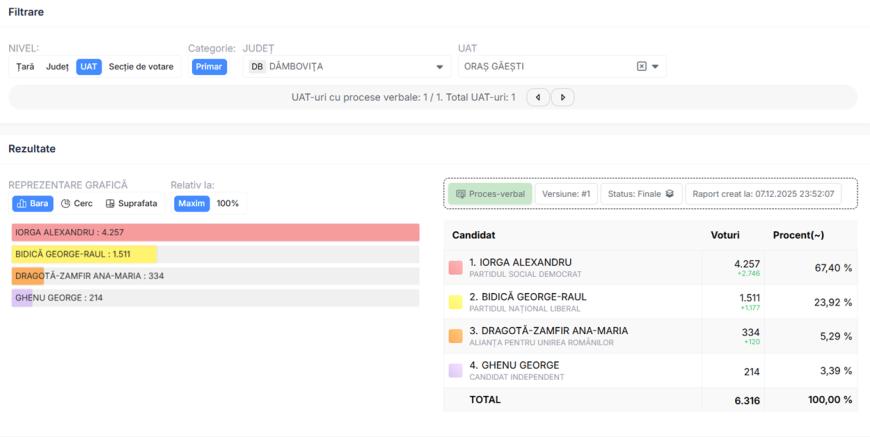 Rezultatele finale arată o victorie detașată pentru candidatul Partidului Social Democrat (PSD). Conform procesului-verbal final, candidatul Iorga Alexandru (Partidul Social Democrat) a obținut un mandat clar, acumulând 4.257 de voturi, ceea ce reprezintă un procent impresionant de 67,40% din totalul voturilor valabil exprimate.