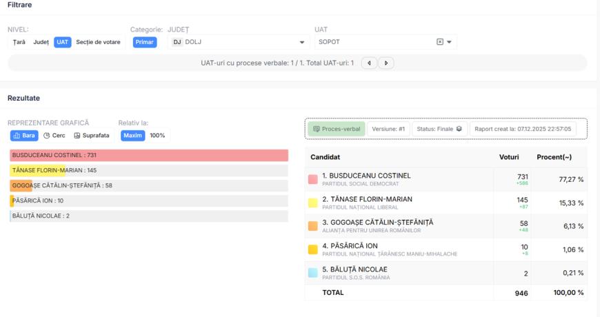Comuna Sopot din județul Dolj a încheiat un nou scrutin local, al treilea organizat în ultimii doi ani, în urma invalidării mandatului anterior al candidatului câștigător. De această dată, Busduceanu Costinel (PSD) a obținut o victorie clară, conform datelor oficiale din procesul-verbal final.