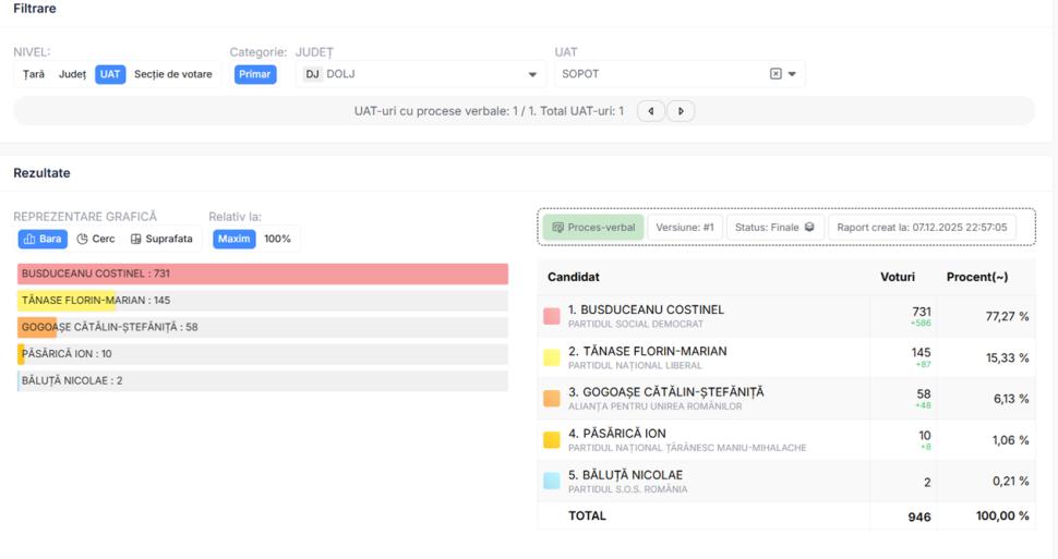 Rezultate finale vot alegeri 2025 Sopot, Dolj. Busduceanu Costinel câștigă detașat Primăria- mandatul anterior i-a fost invalidat