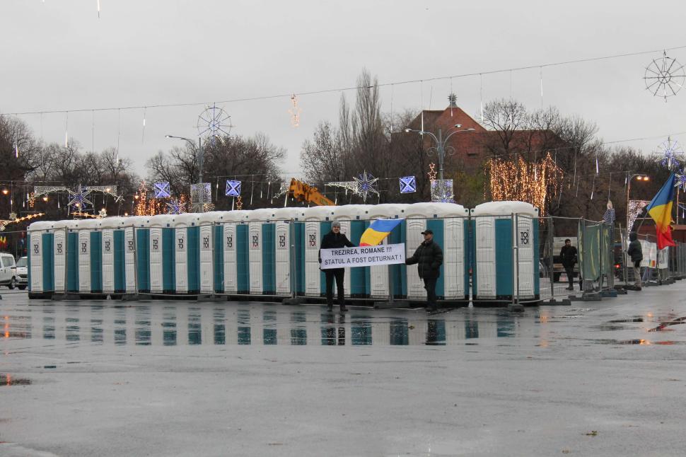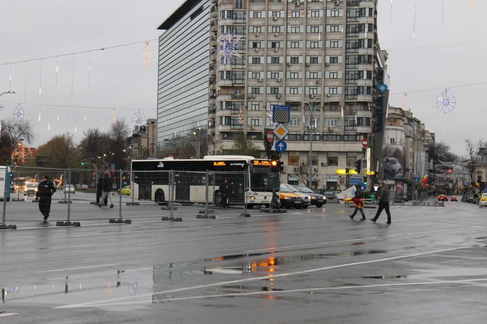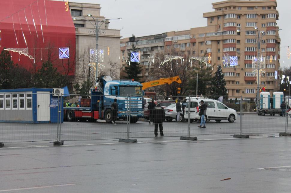 SCANDAL în Piața Victoriei. Câțiva protestatari încearcă să împiedice instalarea Târgului de Crăciun