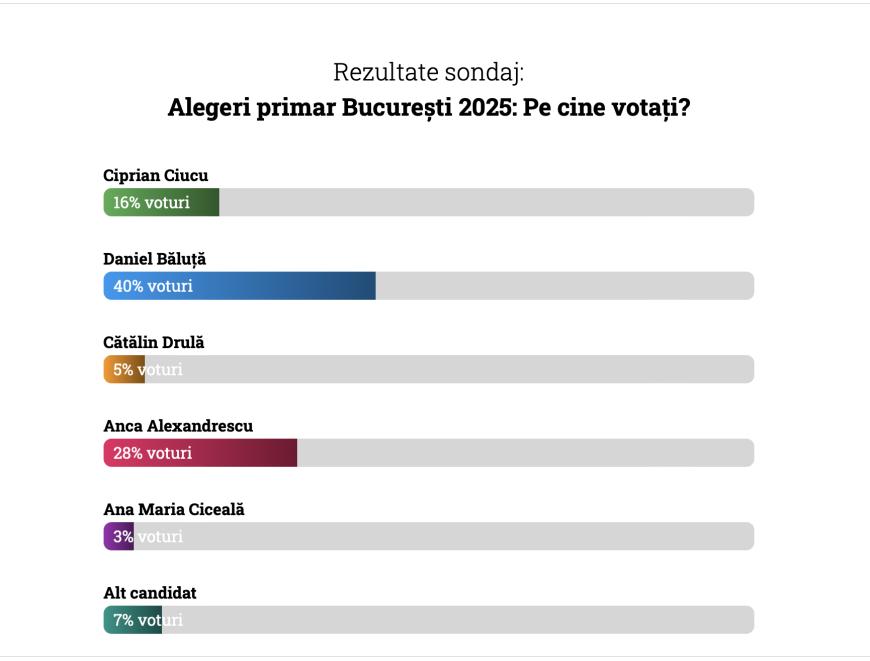 Duminică, în ziua alegerilor pentru Primăria Municipiului București, vă invităm, după ce mergeți la vot, să votați în chestionarul DCNews candidatul ales. Rezultatele vor fi disponibile după închiderea urnelor.