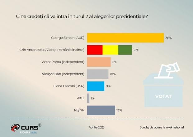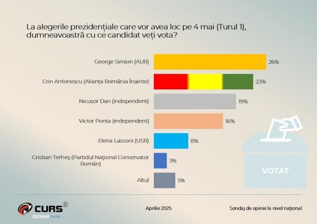 SONDAJ CURS, prezidențiale 2025: Candidatul care ia avans, aproape la egalitate cu George Simion. În turul al doilea, l-ar învinge