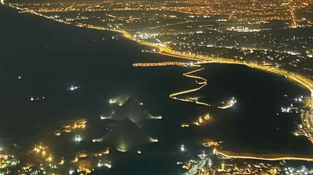 Imediat ce avionul a străpuns stratul compact de nori, s-au evidențiat siluetele piramidelor, luminate discret de strălucirea orașului.
