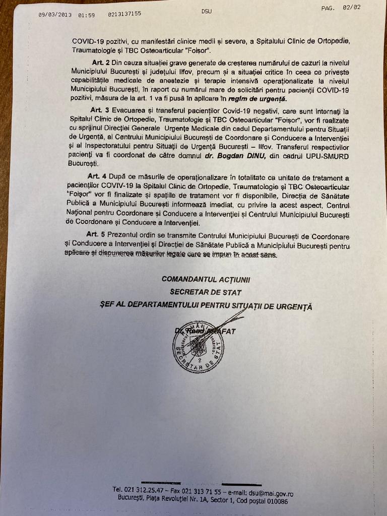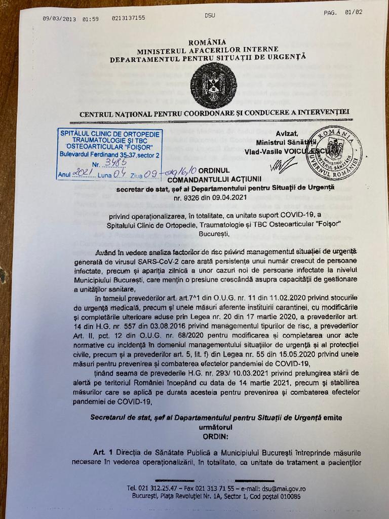 DOCUMENT - Spitalul Foișor, evacuat. Ministerul Sănătății a dat ordinul