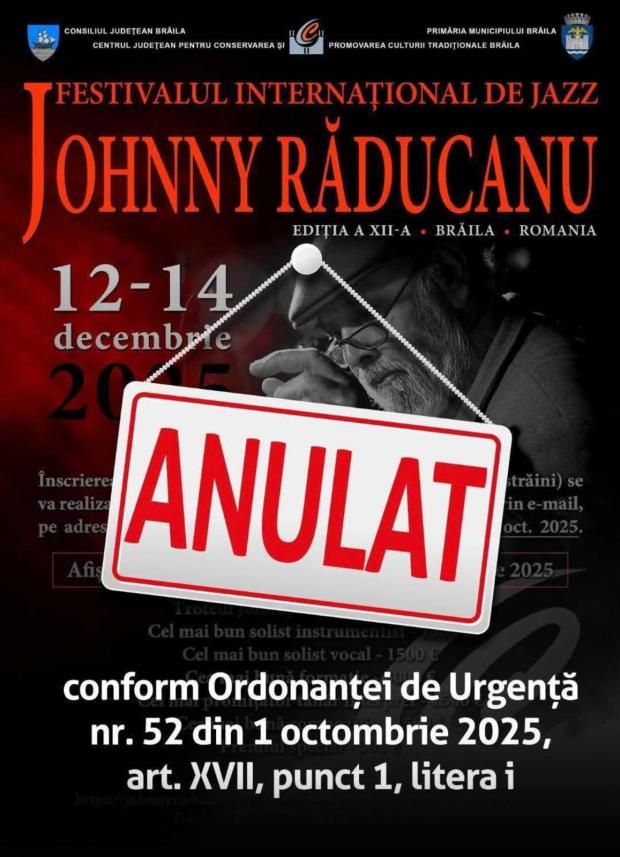 Festivalul Internațional de Jazz „Johnny Răducanu” din Brăila, ajuns la ediția a XII-a, programat între 12 și 14 decembrie 2025, a fost anulat.