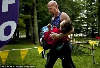 "Tatăl secolului": Un bărbat aleargă la triatlon cu fiica lui bolnavă în braţe