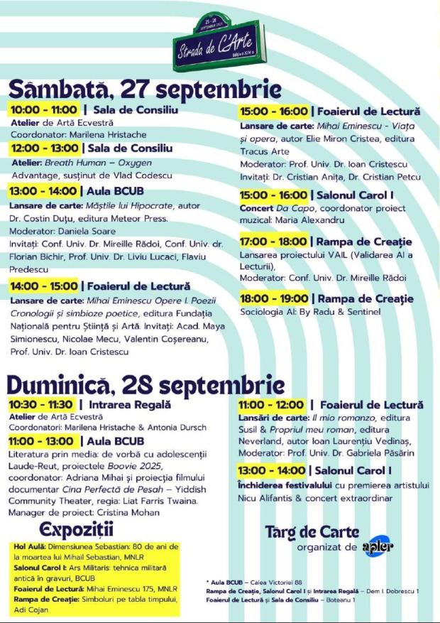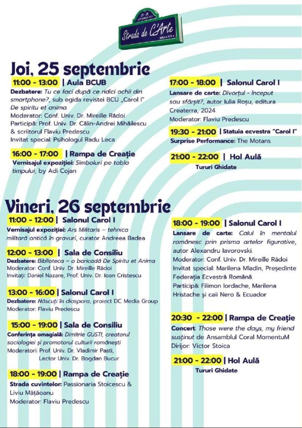 În perioada 25-28 septembrie 2025, Biblioteca Centrală Universitară „Carol I” organizează ediția a XIV-a a festivalului Strada de C’Arte, care, an de an, creează o platformă vibrantă de dialog și cunoaștere pentru iubitorii de cultură, precum și pentru cei care reflectează responsabil la viitorul educației: profesori, scriitori, editori, cititorii, artiști plastici și muzicieni.