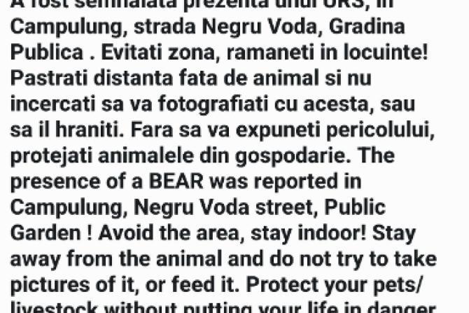 Urs în Grădina Publică din Câmpulung, în centrul orașului. A fost emis mesaj Ro-Alert / „Nu vă fotografiați cu animalul“ / video+foto