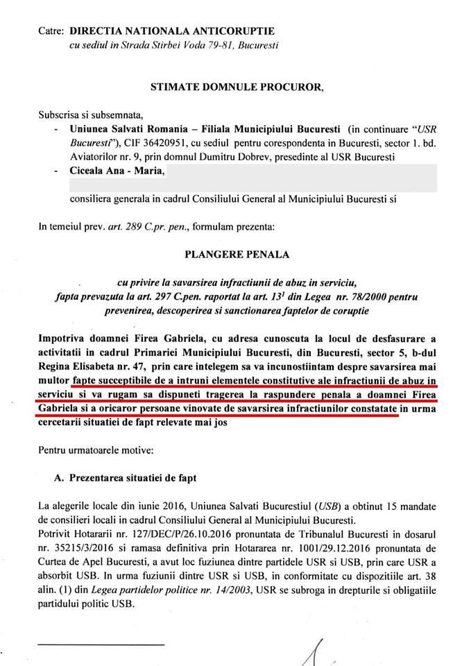 USR Bucureşti, plângere la DNA pe numele Gabrielei Firea
