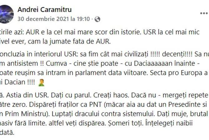”USR, la cel mai mic nivel ever”. Caramitru: ”Bă, ăștia, dați cu parul”. Drulă: Le rupi capul, ca să fie mulțumit! Ultima zvârcolire a acestui sistem