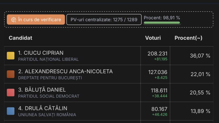 Ciprian Ciucu a fost ales primar al Sectorului 6, din partea PNL, în 2020, în 2024 obținând peste 72% din voturi. În contextul candidaturii la alegerile locale pentru Primăria Municipiului București, din partea PNL, Ciprian Ciucu nu a avut scorul obținut astăzi în niciun sondaj. În momentul transmiterii acestei știri, Ciprian Ciucu se află se la un scor ce depășește 35%.