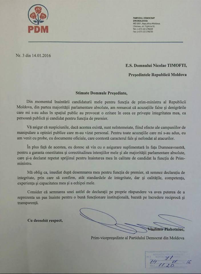 Vladimir Plahotniuc, scrisoare către Nicolae Timofti: Mă oblig...