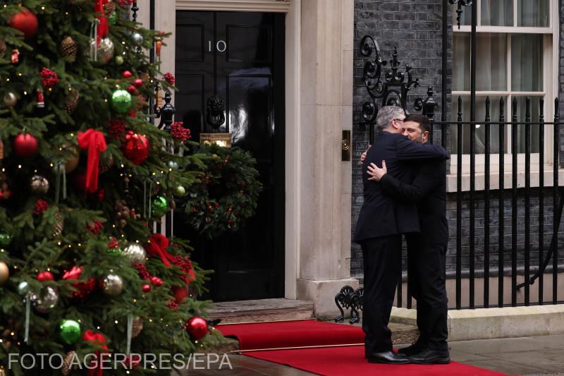 Premierul britanic Keir Starmer și președintele ucrainean Volodimir Zelenski, îmbrățișându-se la sosirea lui Zelenski la Londra, luni, 8 decembrie 2025. Sursa foto: Agerpres