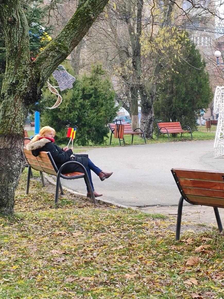 Pe una dintre bănci, o doamnă în vârstă, cu haină neagră și fular roșu stătea relaxată, cu picioarele întinse, și ținea în ambele mâini câte un steguleț tricolor pe care îl răsucea încet, ca pe un evantai.